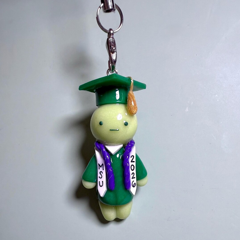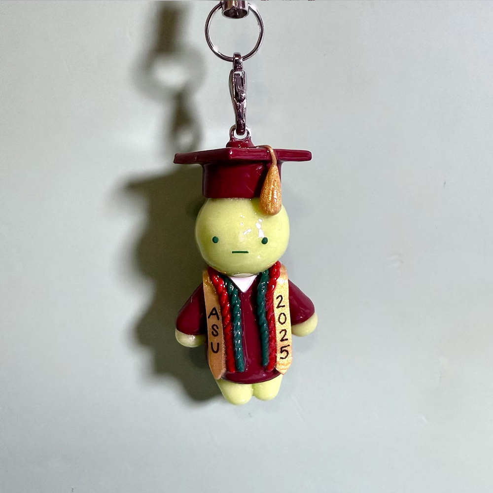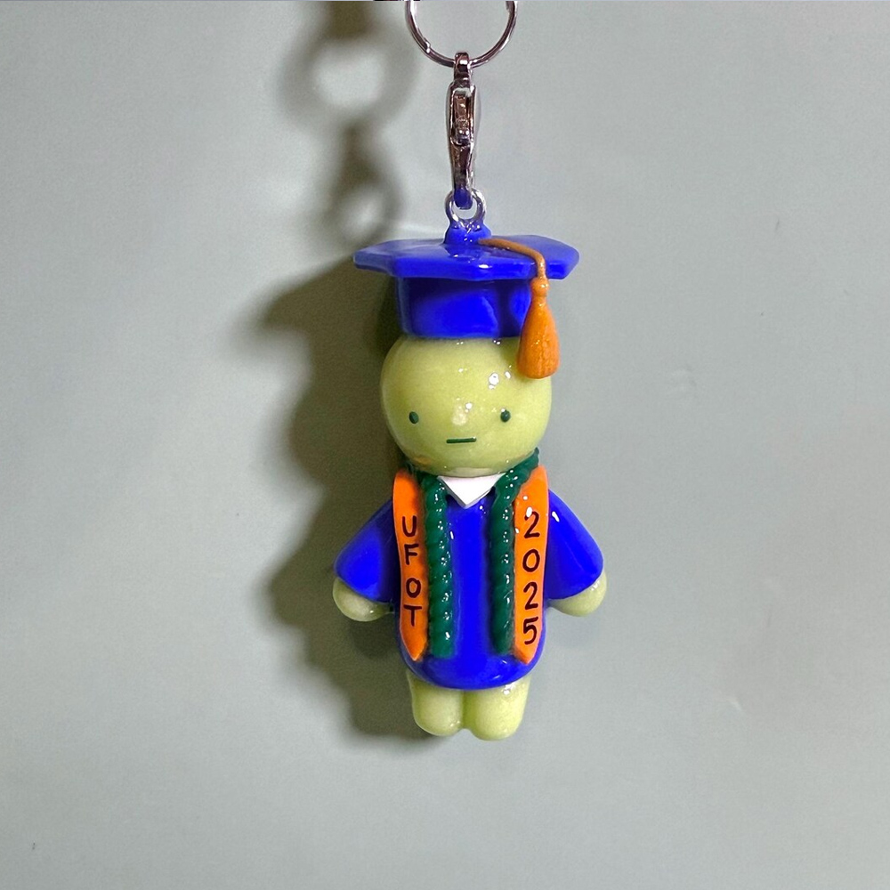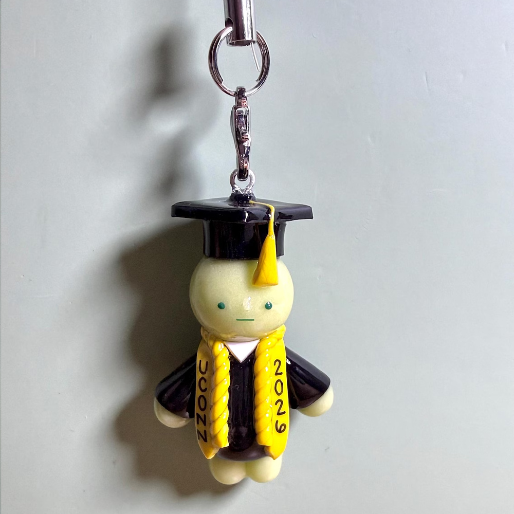 Glowing Grad Figurine – This adorable clay keychain features a cute cartoon graduate in a cap and gown, glowing softly in the dark. The playful design brings joy to everyday moments, making it a fun and meaningful keepsake for anyone celebrating their achievement.