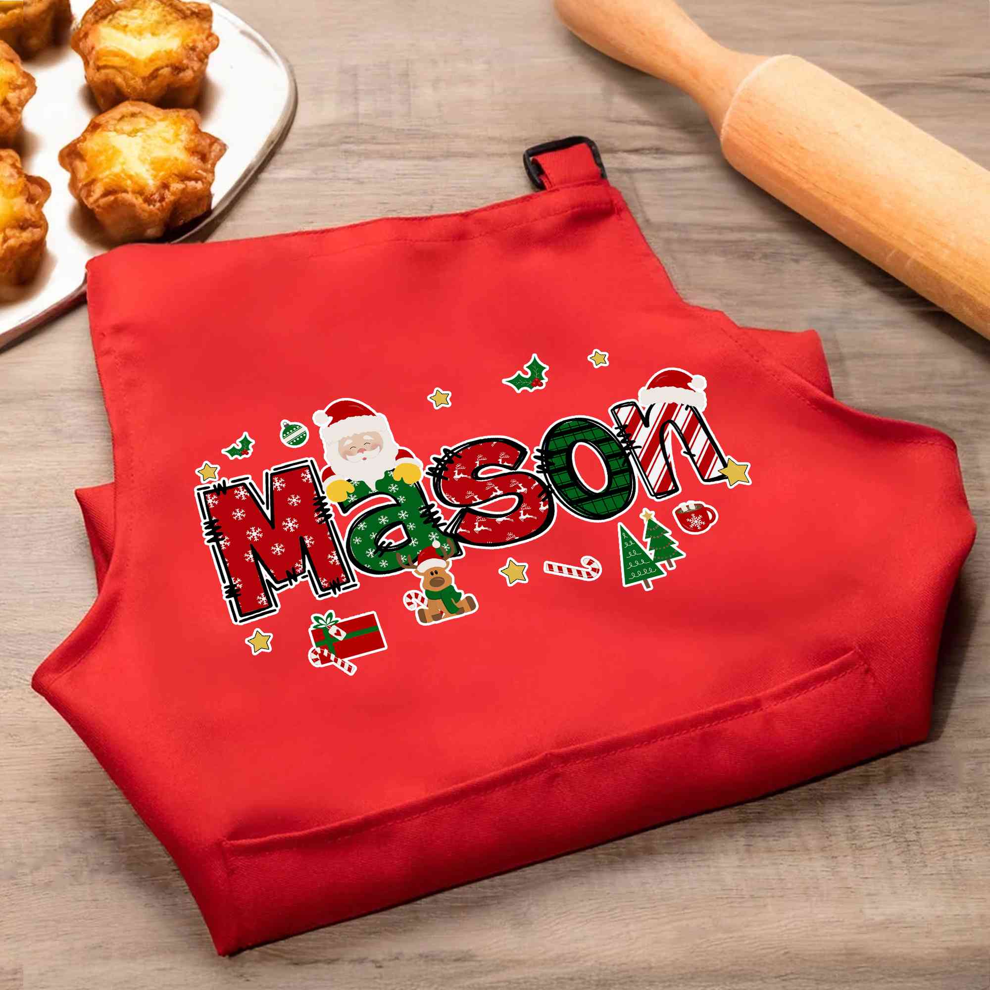 Festive Cartoon Design - This apron set features adorable Christmas theme with bright festive elements such as Christmas trees, Santa Claus, elk, etc., bringing color and cheerful fun to any kitchen activity. The cartoon-style letter and bright patterns give it a playful charm that kids will love, turning every cooking or baking time into an enjoyable adventure.