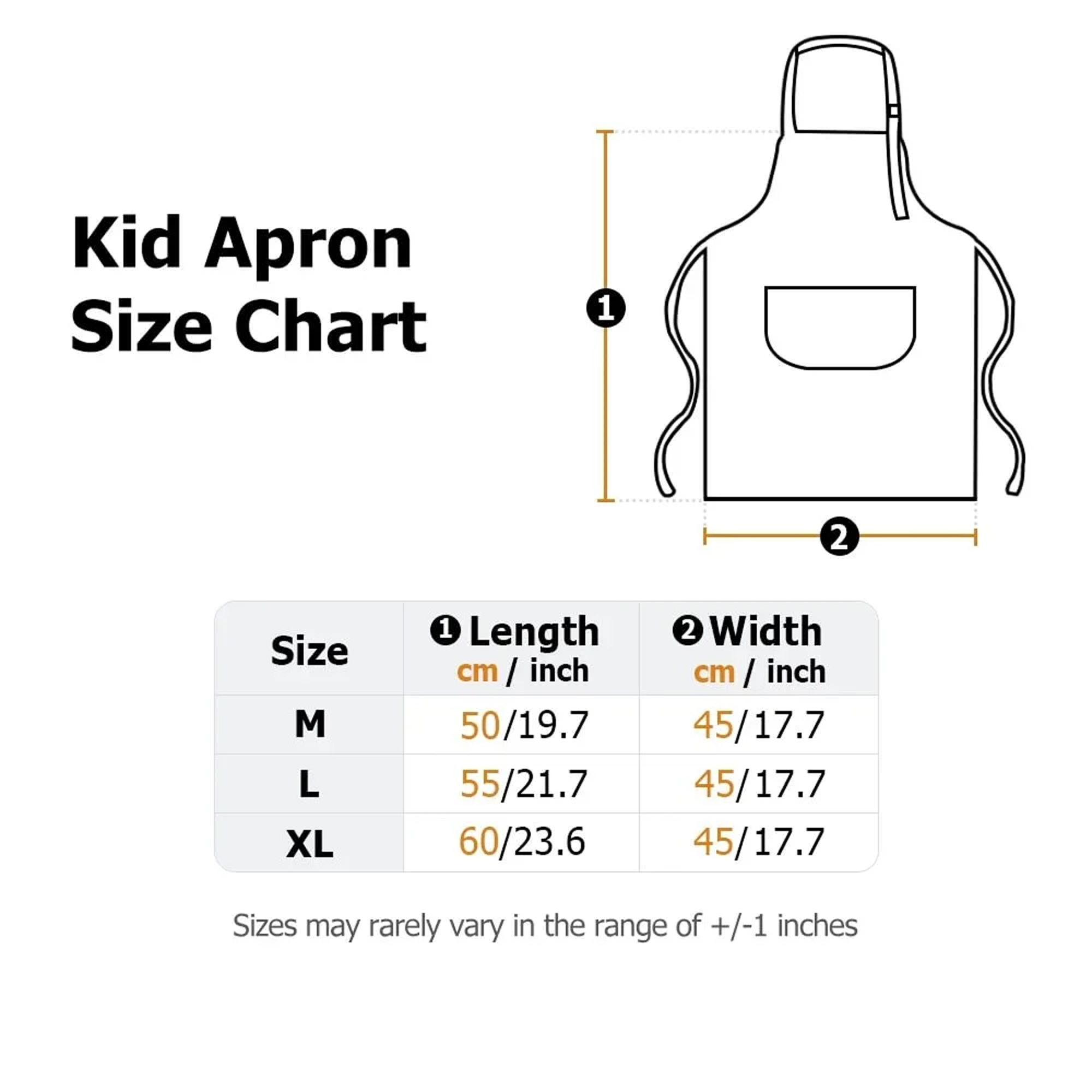 Measurements | Chef Hat: One Size, Adjustable Apron Width*Height: M: 45*50CM (17.7*19.7INCH), for ages 3-5yrs L: 45*55CM (17.7*21.7INCH), for ages 6-8yrs XL: 45*60CM (17.7*23.6INCH), for ages 9-12yrs |