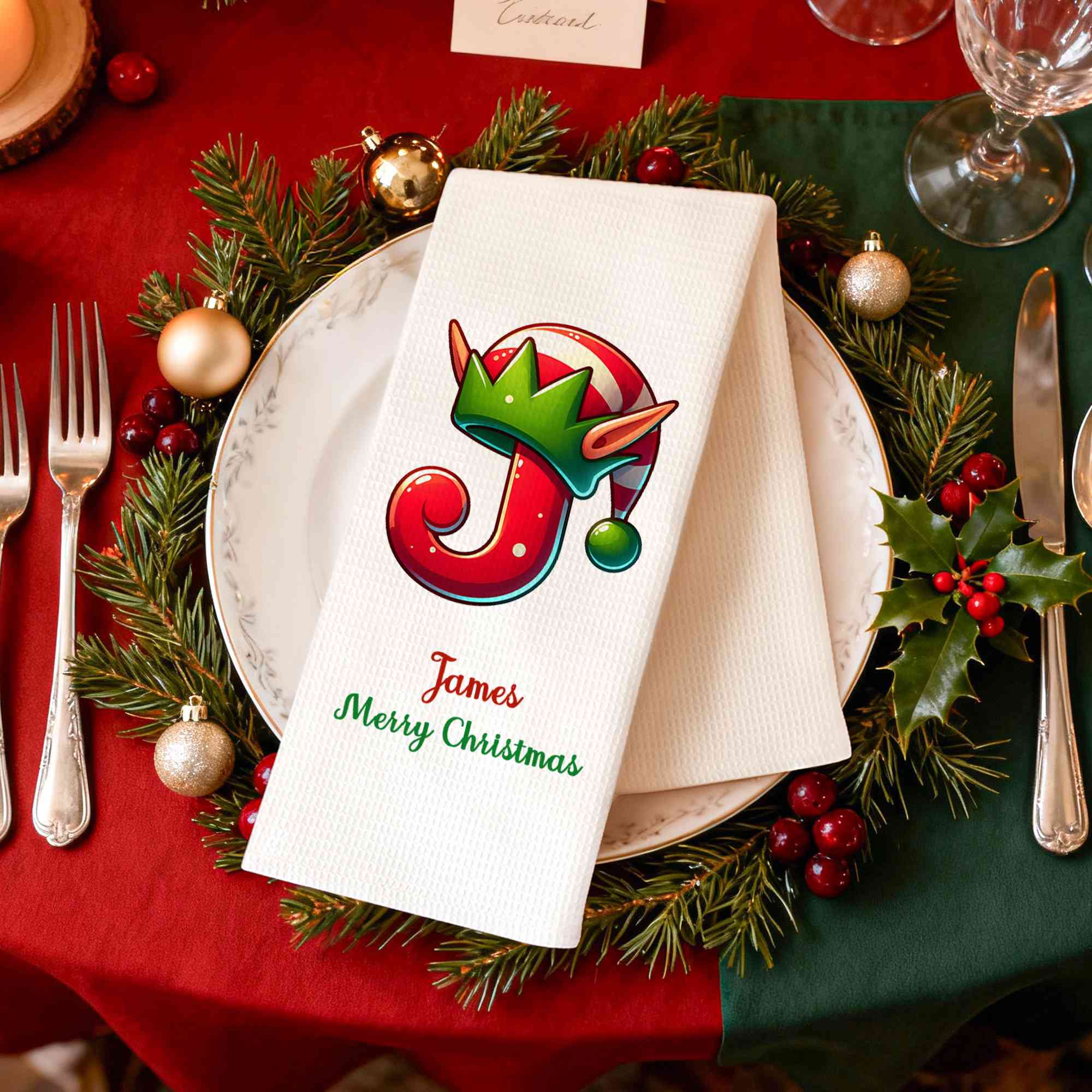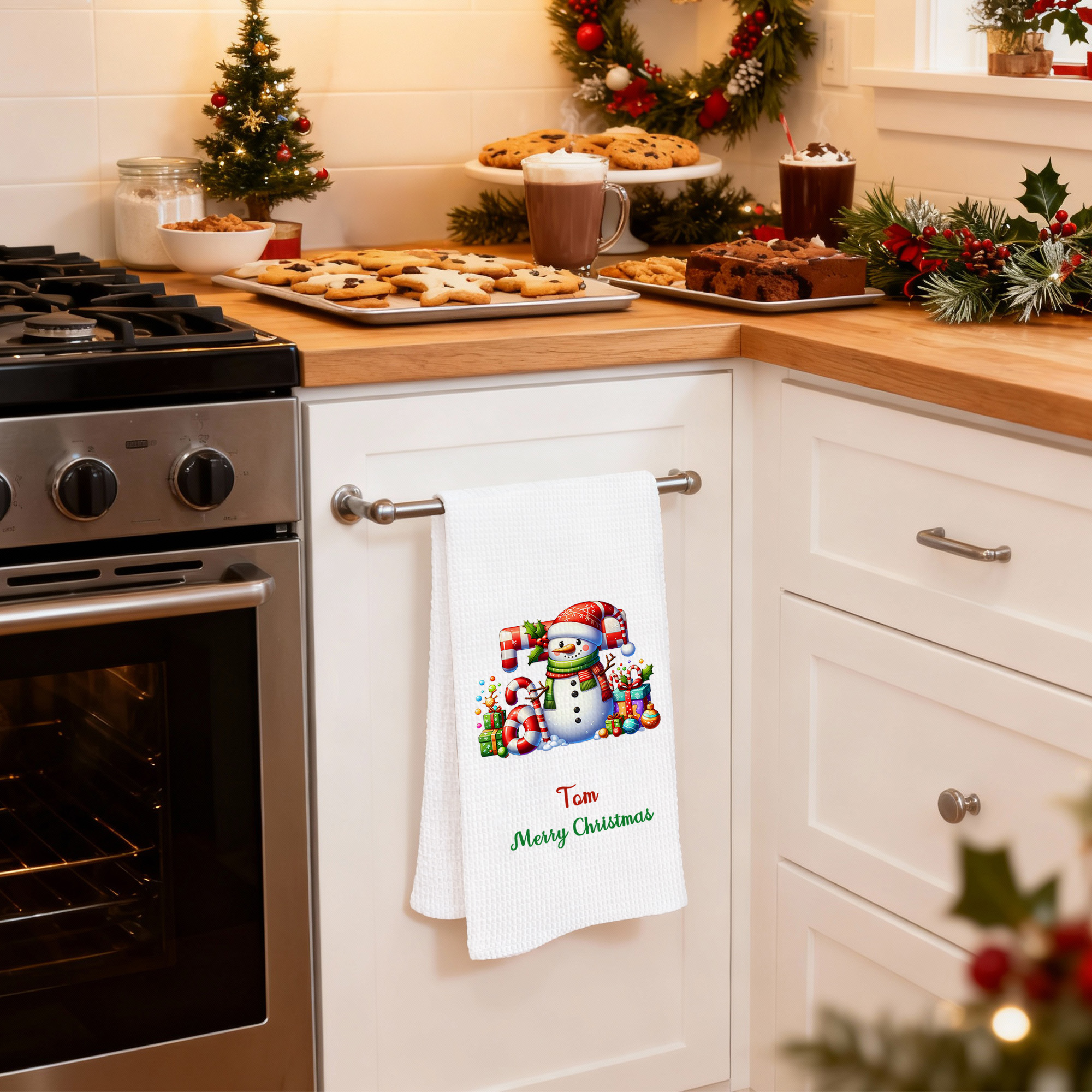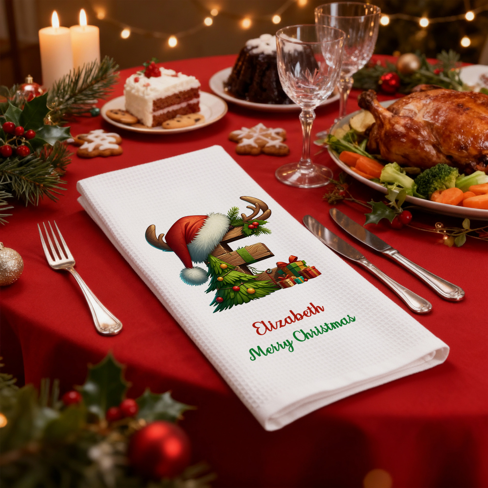 Style | Custom Name & Initial Elf/Tree/Snowman/House Design Christmas Waffle Weave Dish Towel |