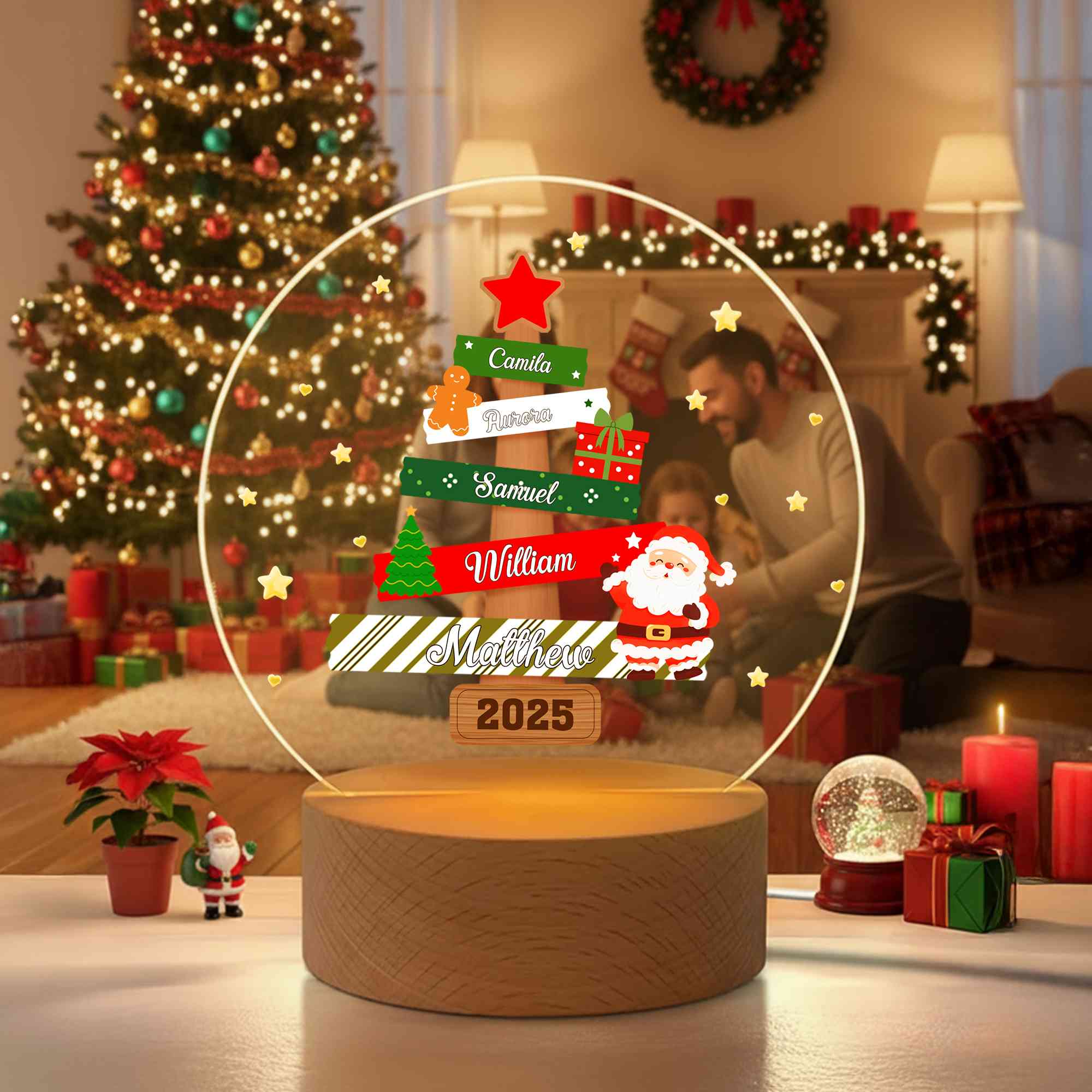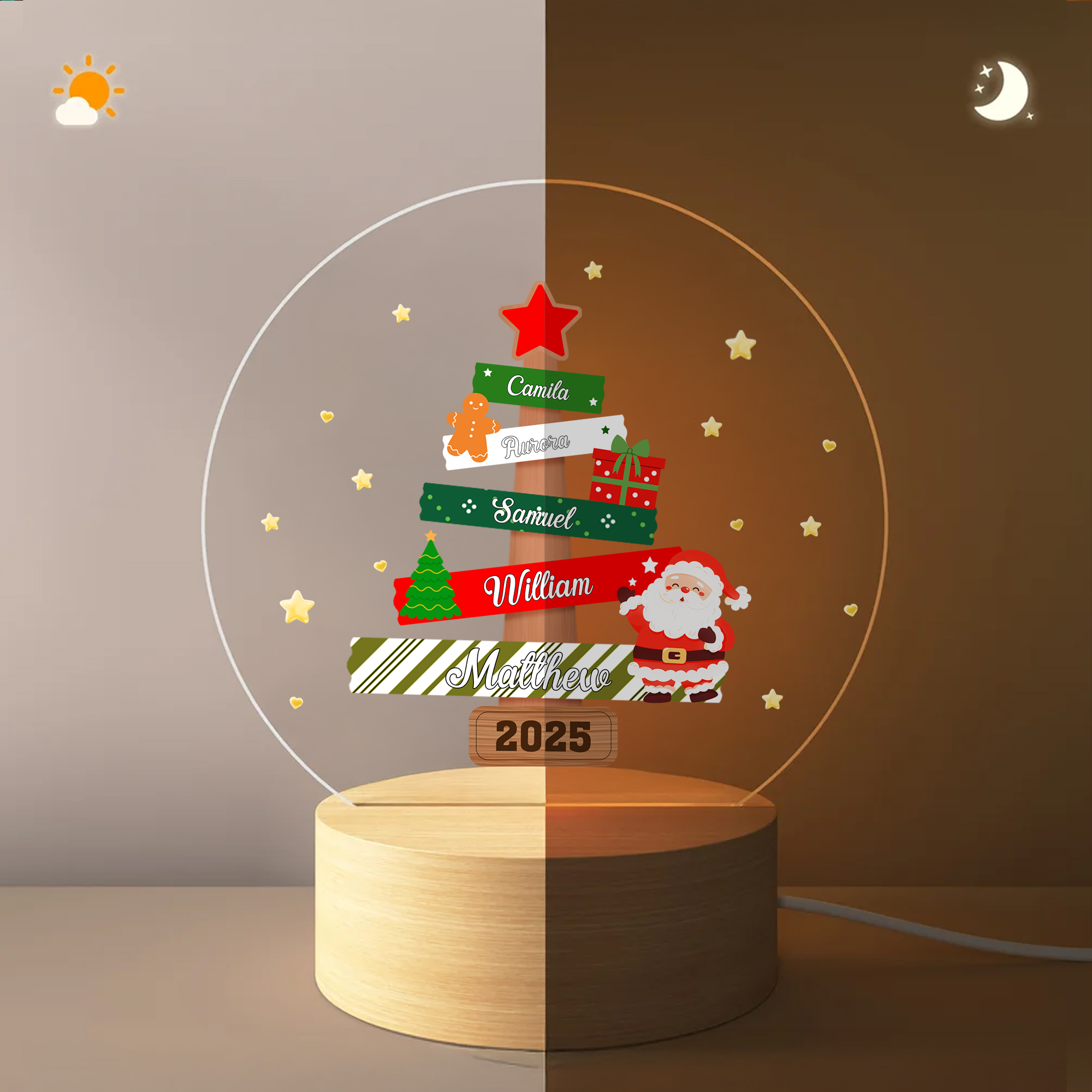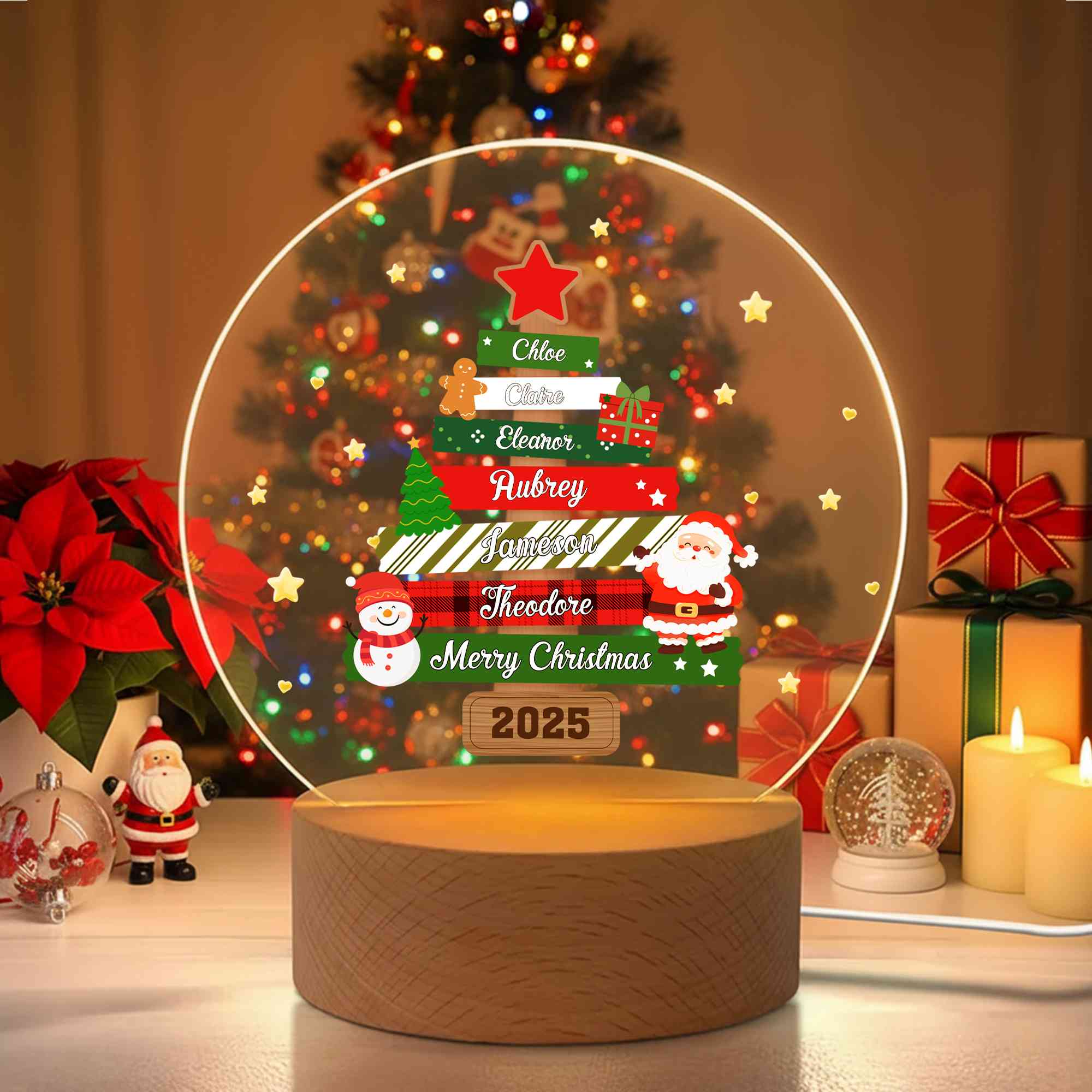 Personalized Cartoon Christmas Tree LED Night Light with Names, Acrylic Night Lamp with Wooden Base, Home Decor, Christmas Gift for Family/Kids
