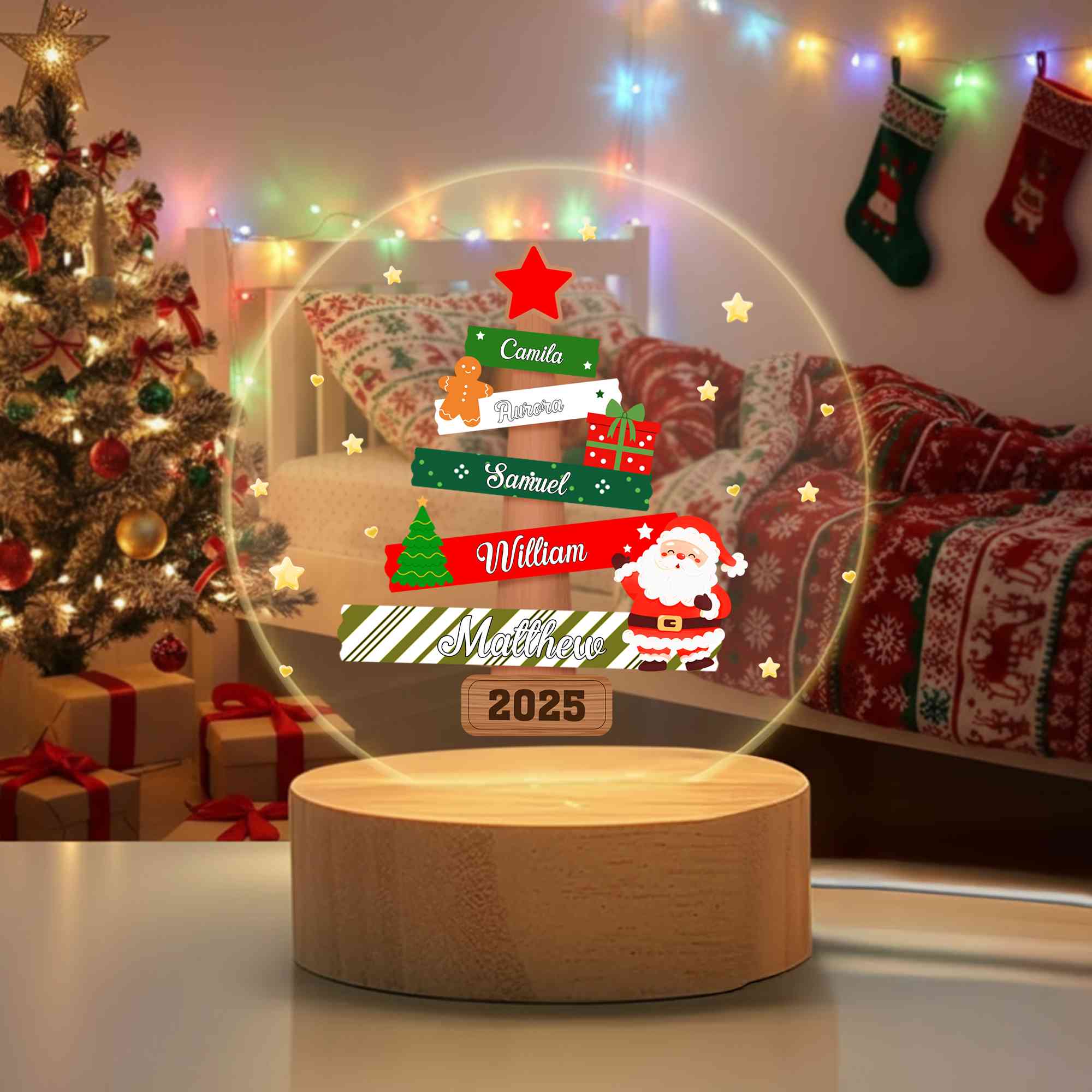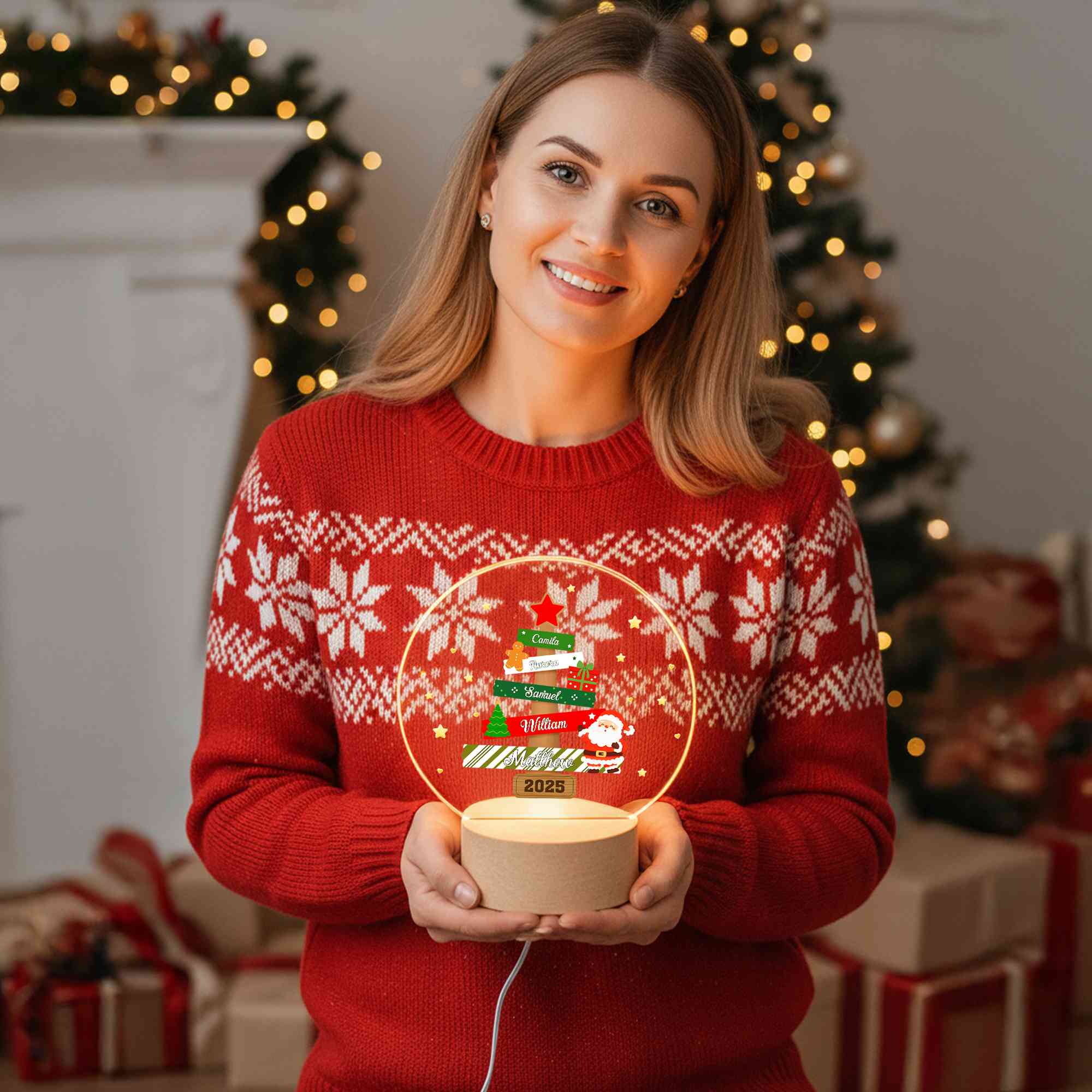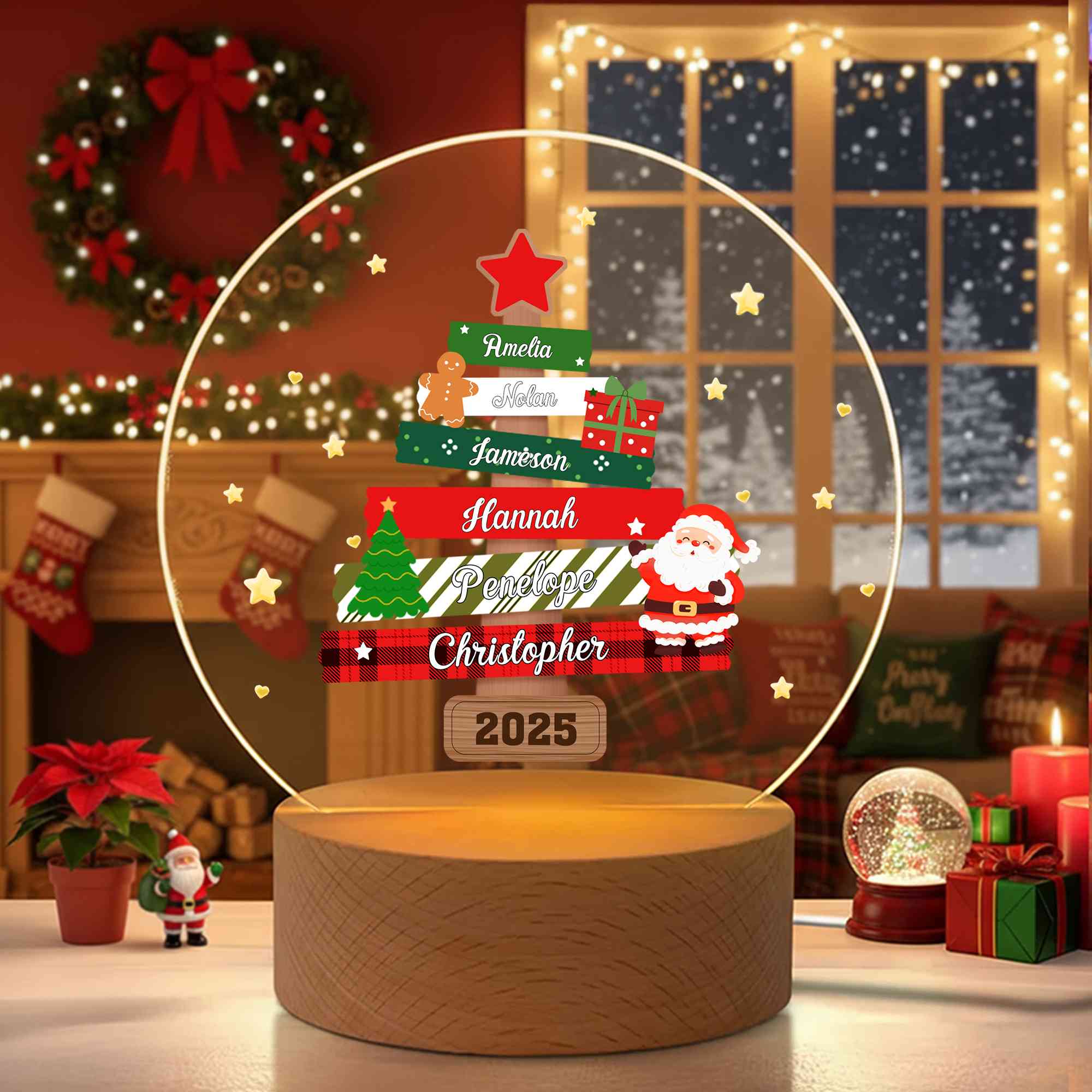 Personalized Cartoon Christmas Tree LED Night Light with Names, Acrylic Night Lamp with Wooden Base, Home Decor, Christmas Gift for Family/Kids