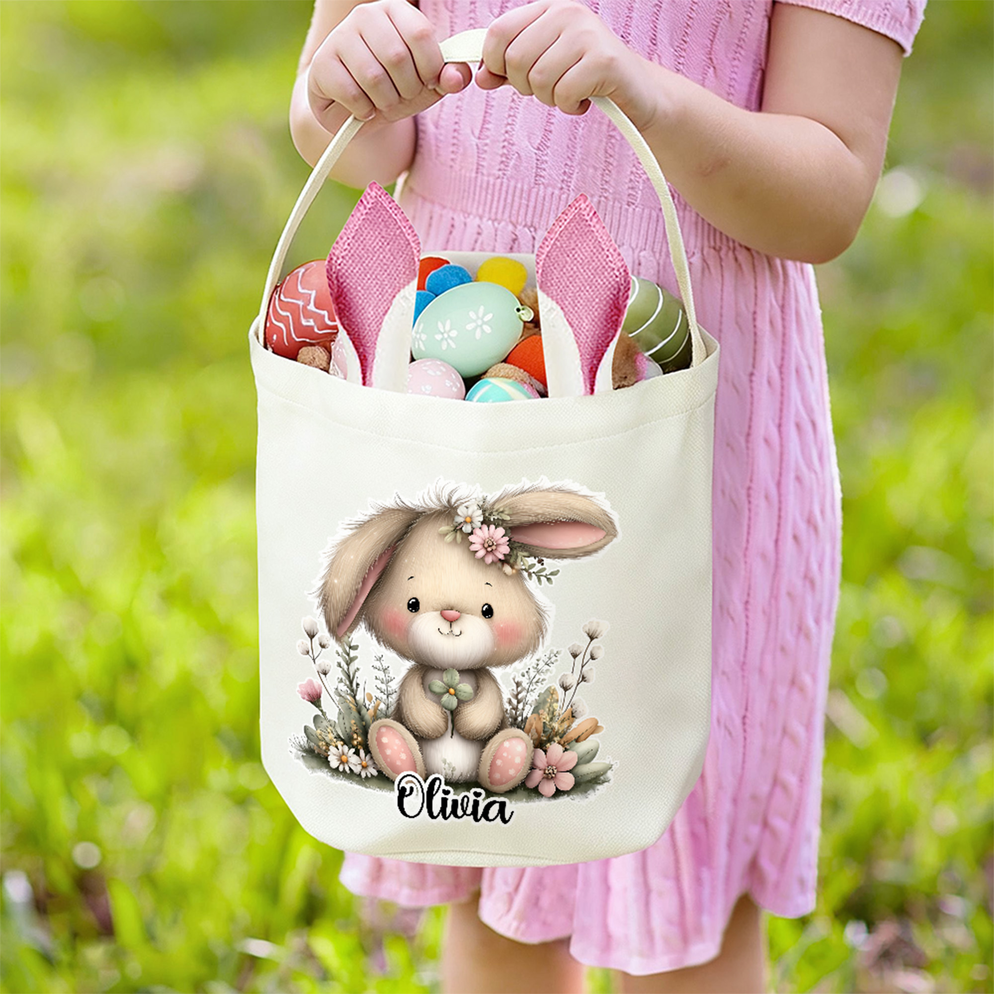 Personalized Name Cute Cartoon Floral Rabbit Easter Basket, Cotton Linen Easter Bucket Bag with Bunny Ears, Easter Party Favor, Easter Gift for Kids