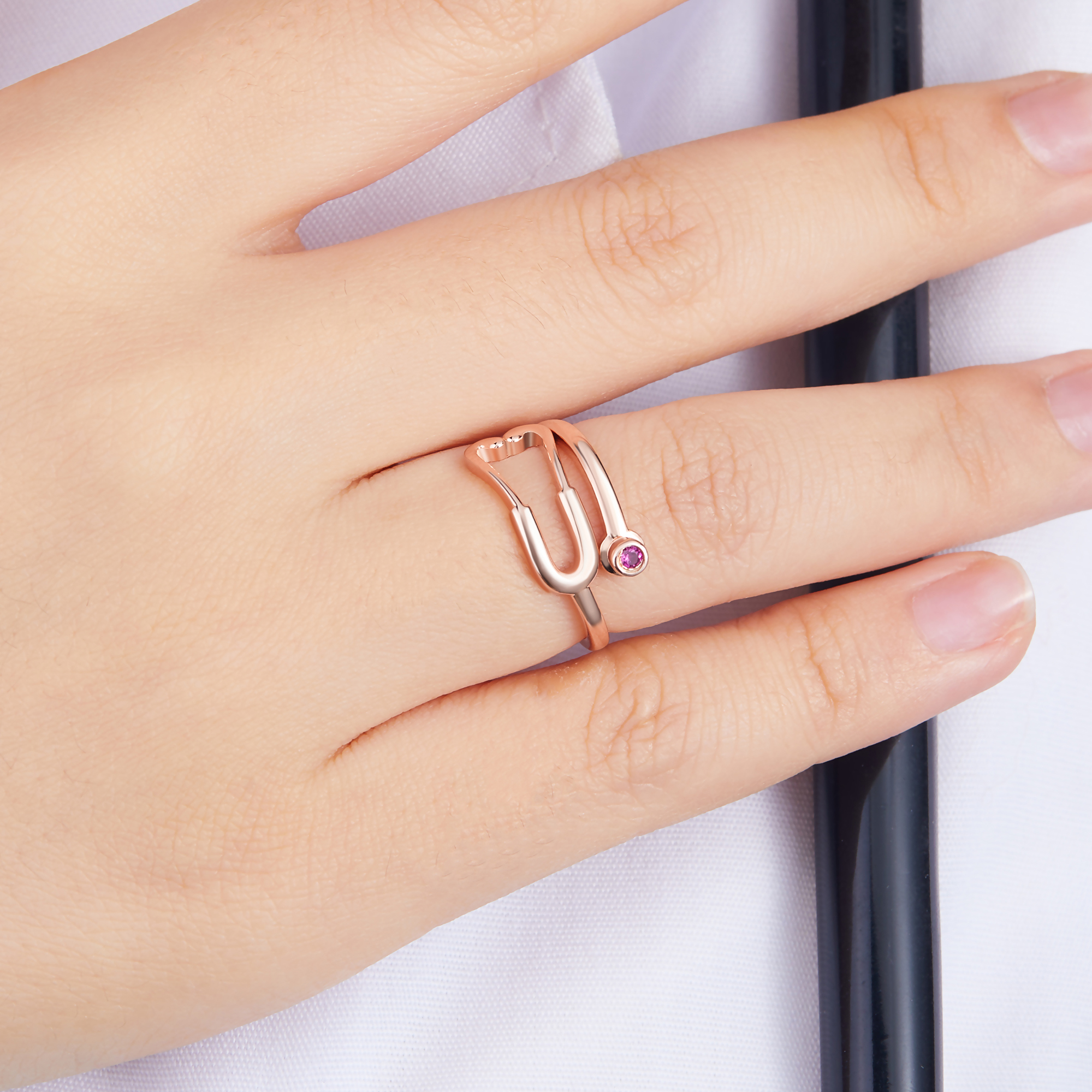 Stethoscope-Inspired Design - This custom ring showcases a refined stethoscope motif that gently wraps around the finger, creating a graceful and symbolic look. The added birthstone brings deeper meaning, reflecting care, commitment, and compassion in healthcare.